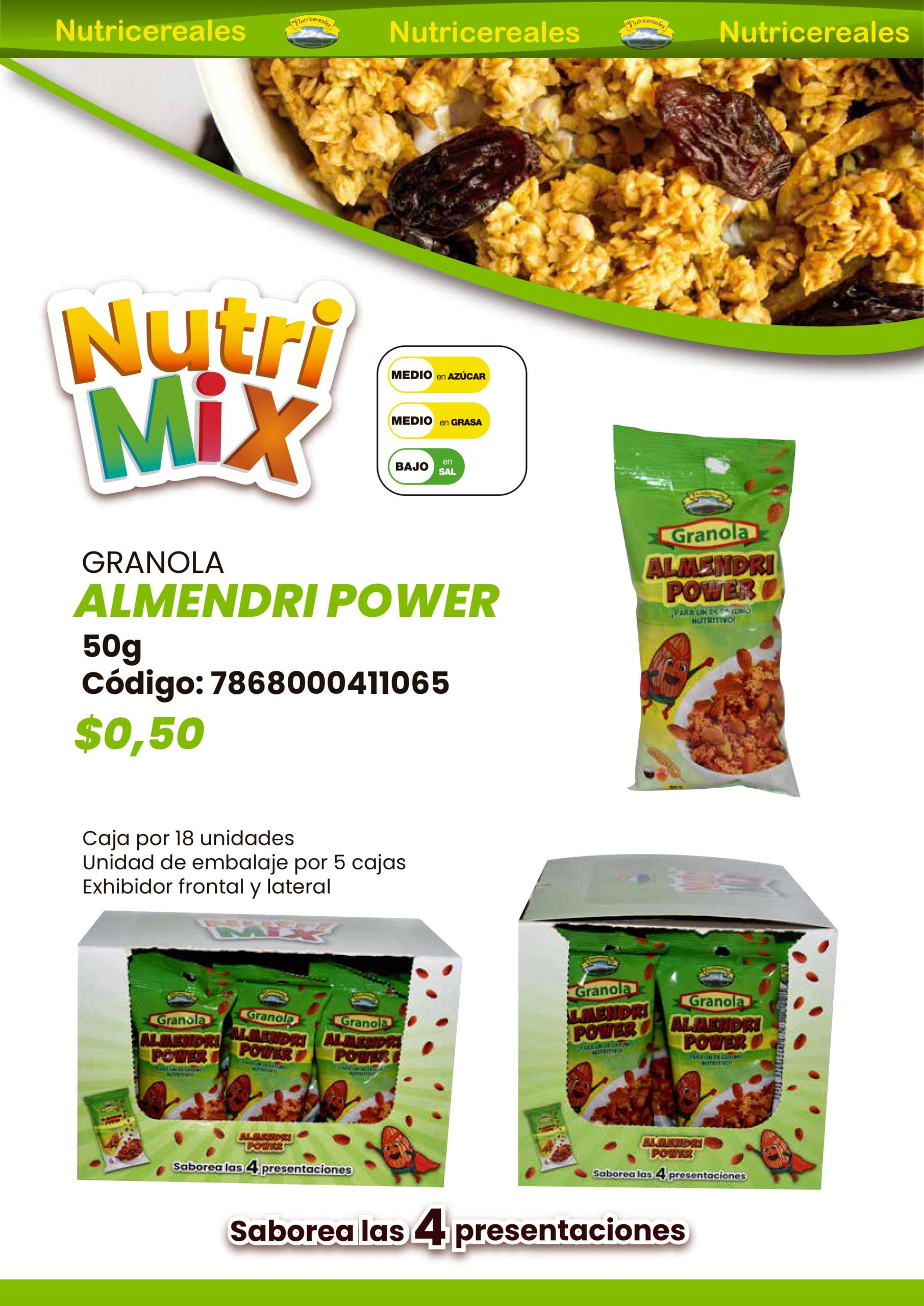 GRANOLA 50g Code: 7868000411065 ALMENDRI POWER Box contains 18 bags. Packaging unit for 5 boxes Box with Front and side display