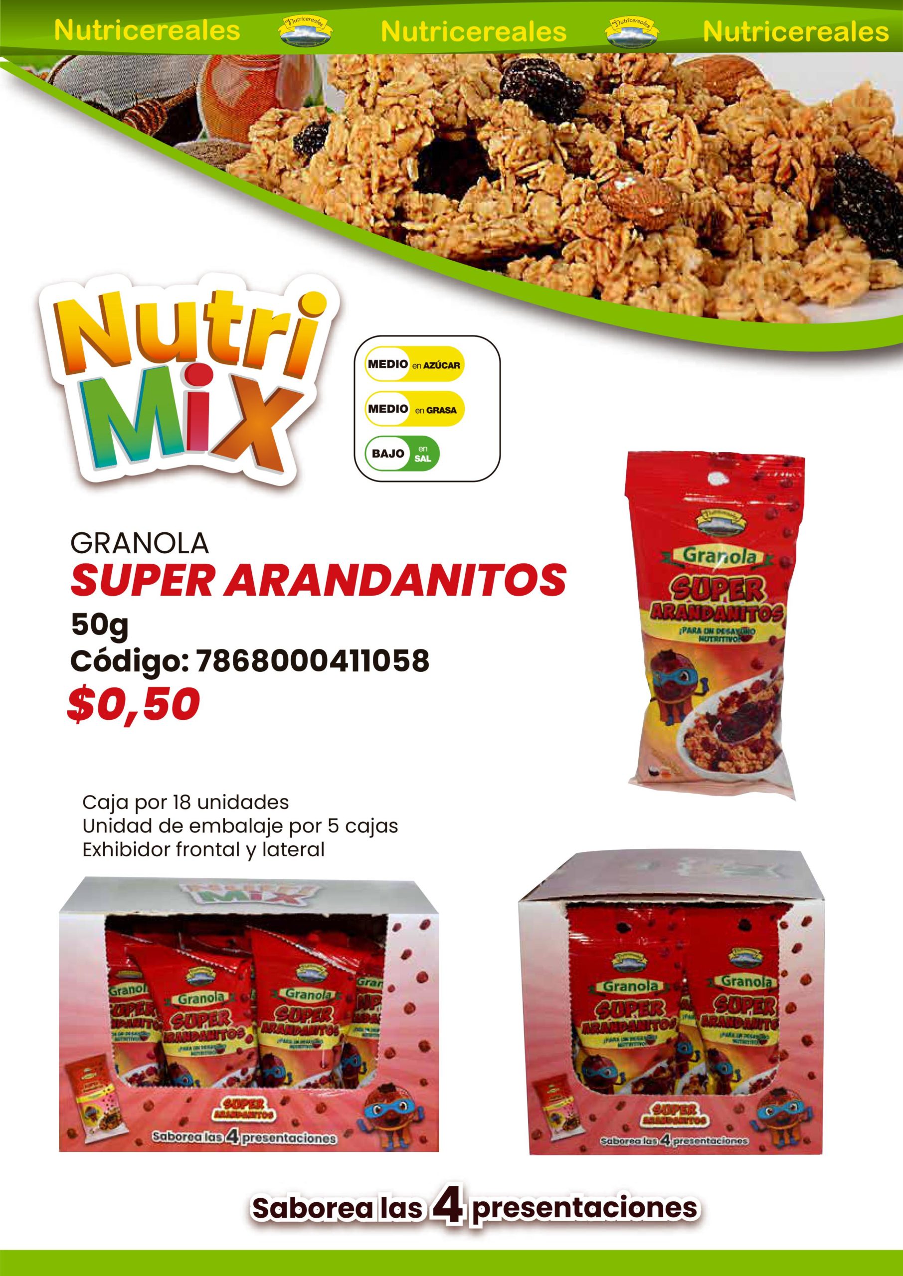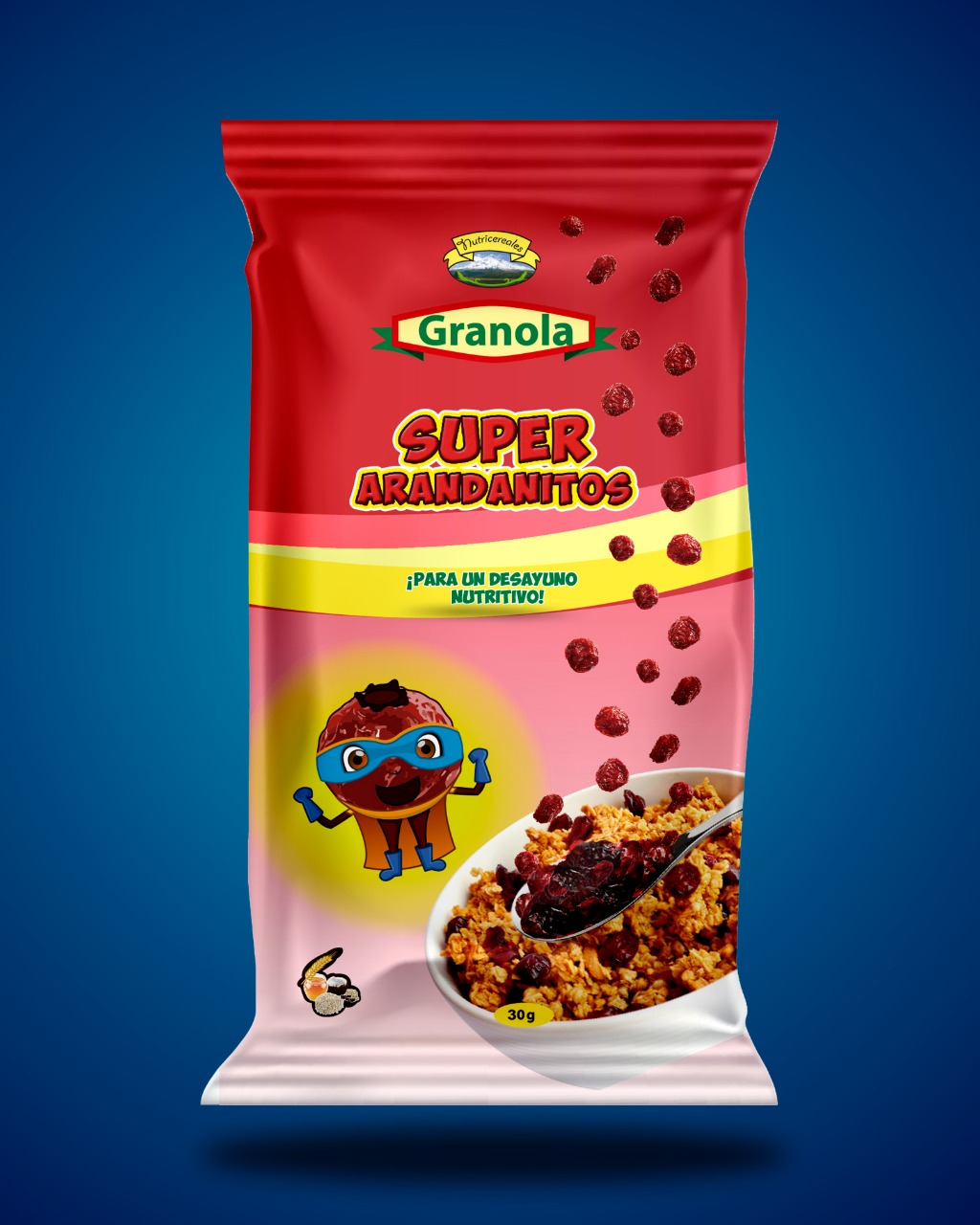 - Soy SUPER ARANDANITOS, con mi grupo de amigos me siento protegido y un campeón….Ingredientes: Avena, panela, aceite vegetal de soya, arándanos, azúcar morena, coco, sal, canela, saborizante artificial de naranja.
